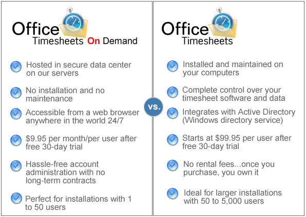 Office Timesheets is available in two versions: hosted (Office Timesheets On Demand) and self-installed (Office Timesheets). Below is breakdown of features and benefits with each version to help you decide which is best for your organization:
