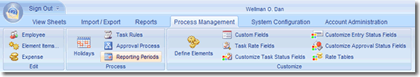 Office Timesheets’ Process Management tab houses the features, functions and data that drive your company’s time and expense tracking processes, policies and procedures; and is typically managed by those responsible for managing clients, projects, employee groups, etc. The features found in Office Timesheets’ Process Management tab form the underlying framework for tracking time and expense data in Office Timesheets; and are typically in constant motion with your organization. The Office Timesheets Process Management tab houses the following features: