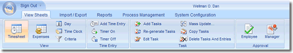 Office Timesheets’ View Sheets tab houses the features and functions for collecting and managing time and expense entries. The View Sheets tab contains features and functions for employees to enter time and submit their time and expenses; for managers to process and approve employees’ time entries; and for project and financial managers to update/process time and expense entry statuses for reporting, billing and exporting to other applications. As with other tabs, what a particular user can see and do within the View Sheets tab is determined by Office Timesheets’ Security Policies. For example, the typical employee may only see those functions needed to enter time and expenses and to submit them to their manager. The Office Timesheets View Sheets tab houses the following features: